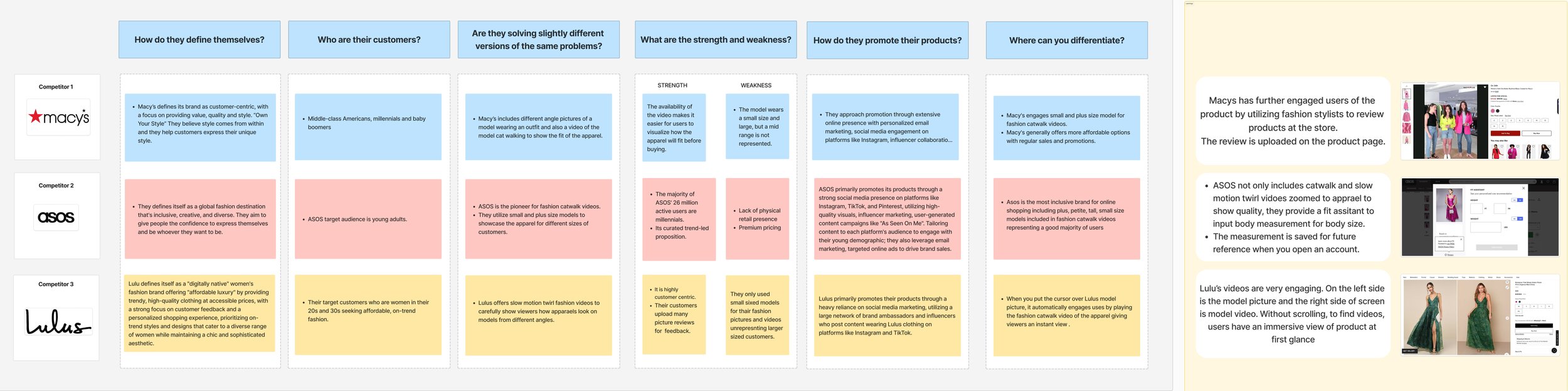 To understand how video impacts online fashion shopping, I analyzed Macy’s, ASOS, and Lulus—brands I shop from regularly. Each competitor uses video to strengthen product clarity and help shoppers make confident sizing decisions.