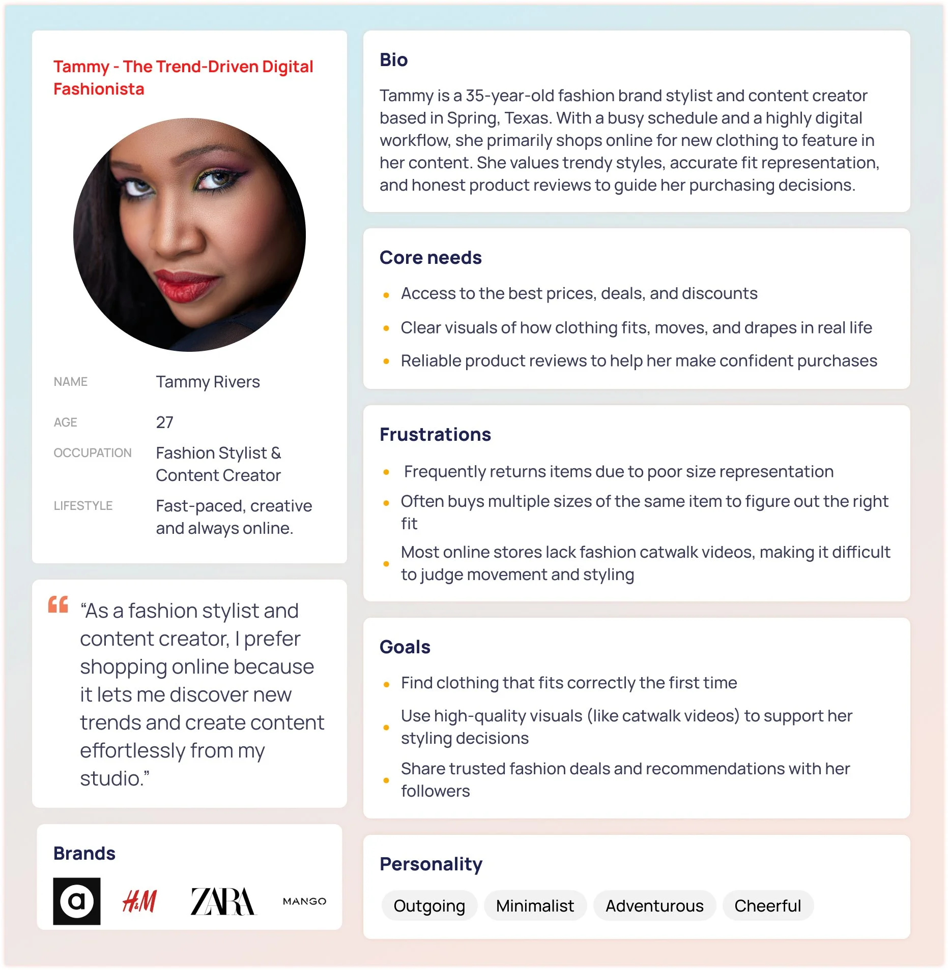 Tammy is a 35-year-old fashion stylist and content creator who shops almost entirely online to discover new, trendy pieces for her work. Because she relies on accurate visuals to choose outfits for styling and content shoots, she prefers websites with fashion catwalk videos that show real movement and fit. Her biggest frustration is receiving items that don’t fit as expected, leading to frequent returns— making her an ideal user for a Catwalk Video feature.