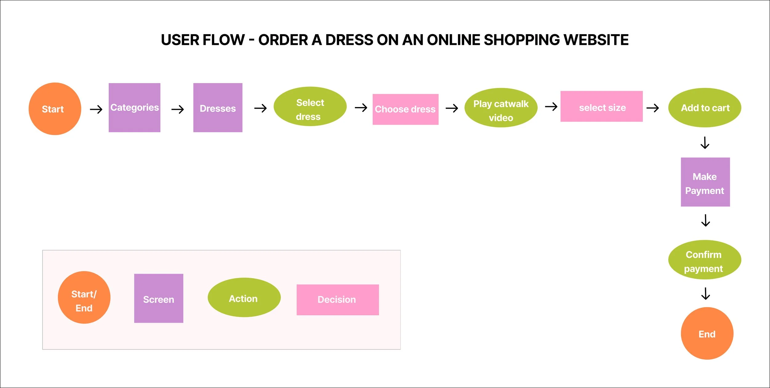 This user flow illustrates how a Target shopper orders a dress online, with a special focus on product confidence through fashion catwalk videos. The flow follows a familiar e-commerce journey while integrating video as a key decision-making touchpoint.