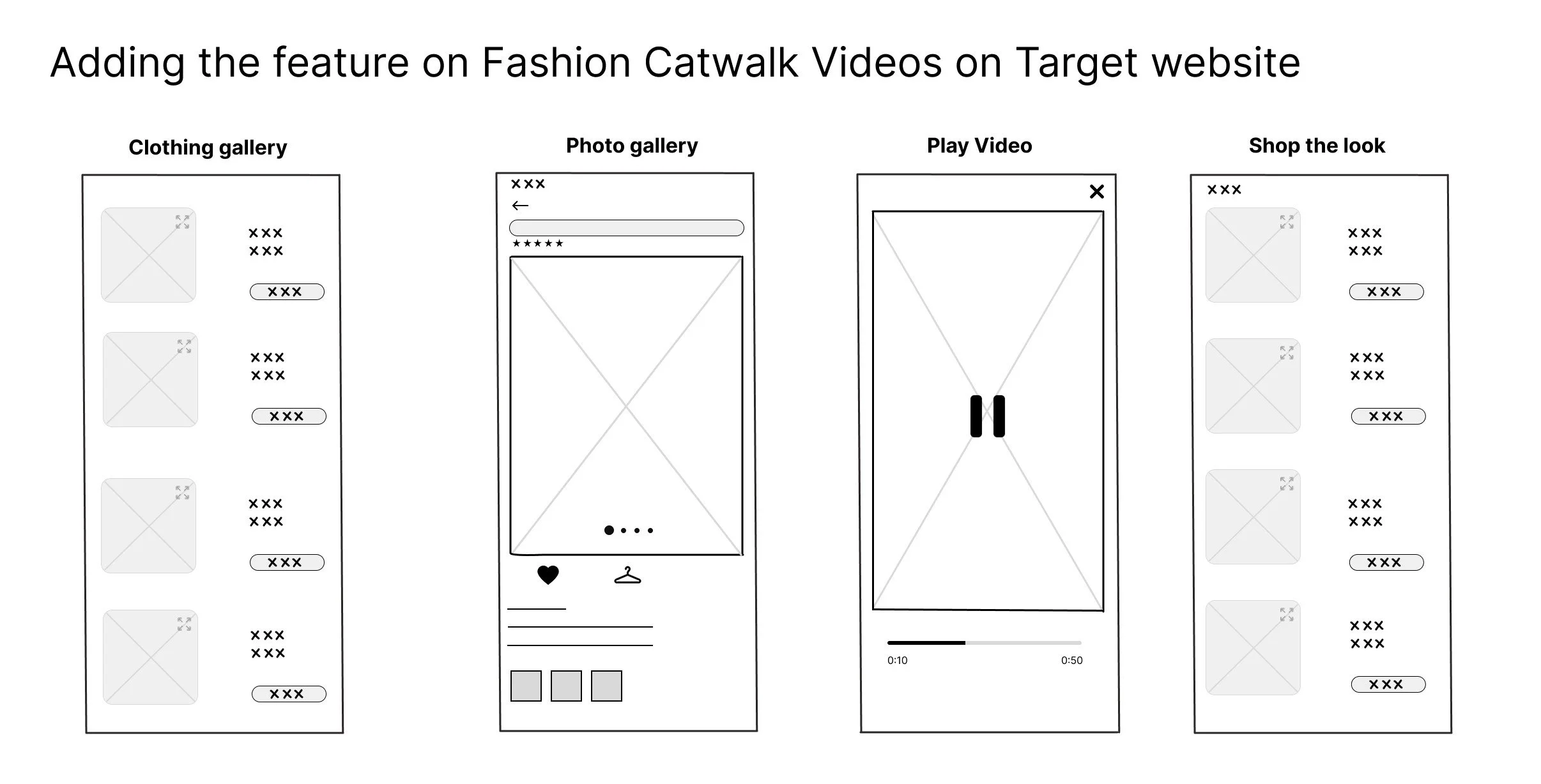 Sketching the catwalk video feature for Target’s fashion category allowed me to visualize how customers interact with apparel before purchasing. At this early stage, I created low-fidelity wireframes to explore how catwalk videos could seamlessly integrate into Target’s current product browsing experience — from the clothing gallery to product detail pages and a “Shop the Look” extension.