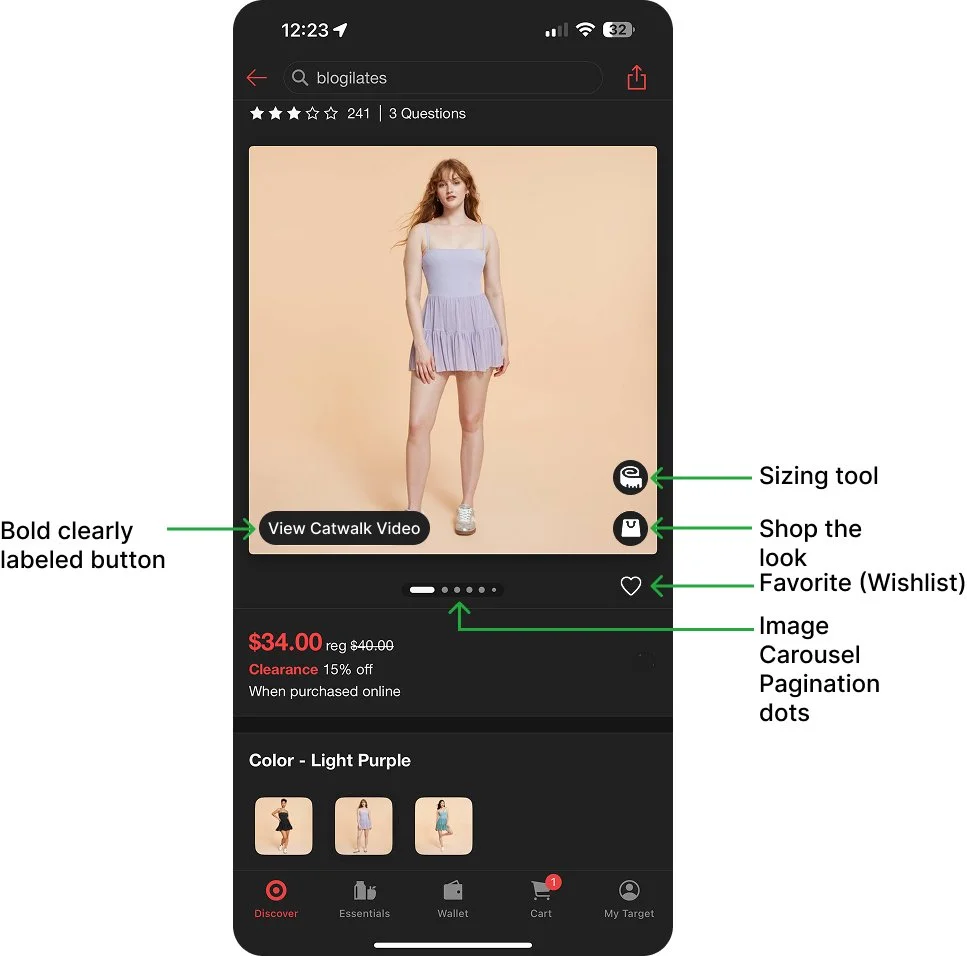 I focused on aligning the needs of Target shoppers, the business, and the technical team to bring the Catwalk feature to life. As both a shopper and designer, I saw how valuable it would be for users to view clothing in motion and make more confident sizing decisions. For the business, this feature supports stronger brand identity, higher sales, and improved customer satisfaction. On the technical side, it requires high-quality video integration and smooth, reliable playback.