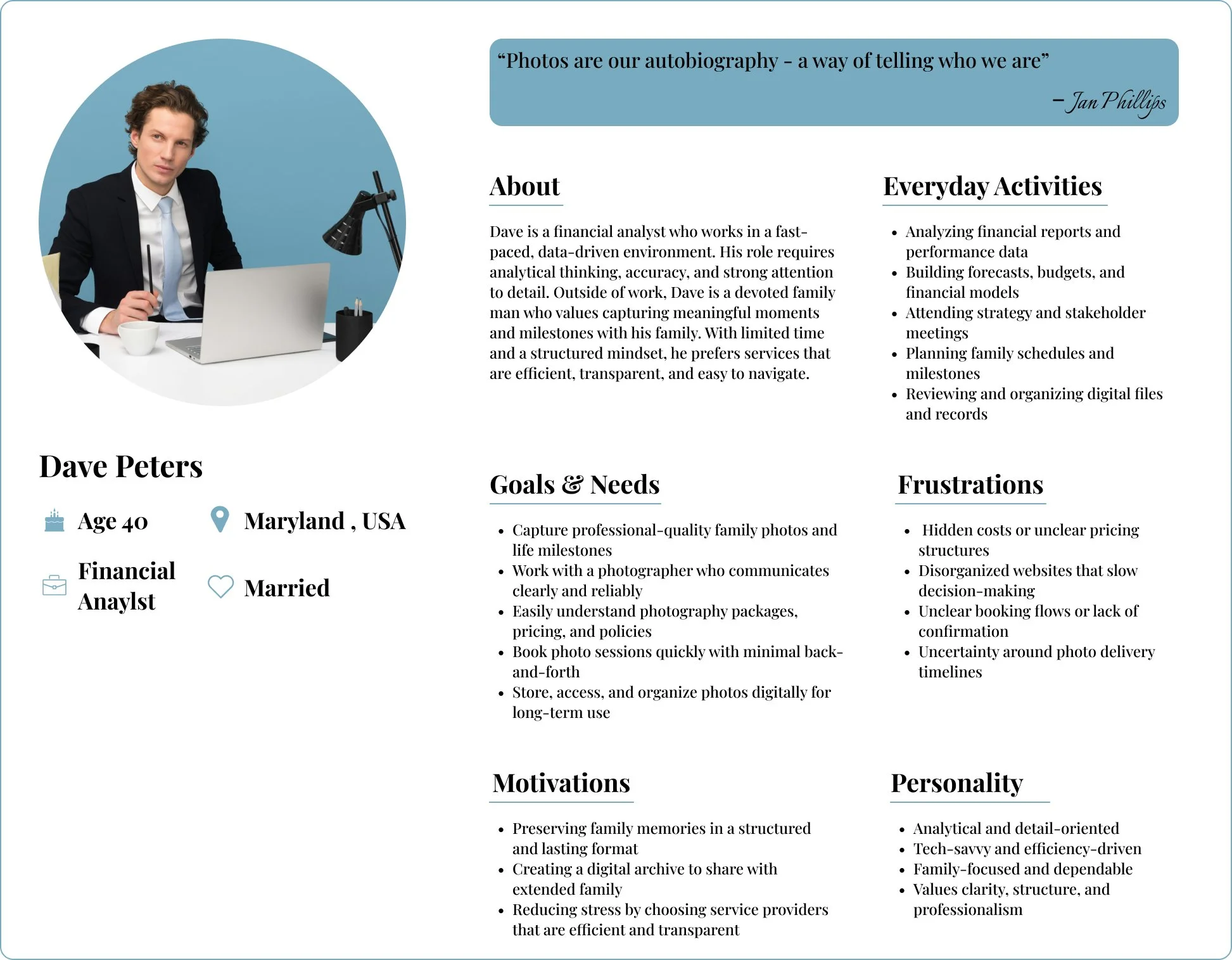 Dave Peters is a busy financial analyst and devoted family man who values clarity, efficiency, and transparency. He seeks a seamless photography experience that makes it easy to book sessions, understand pricing, and confidently capture meaningful family milestones without stress or uncertainty.