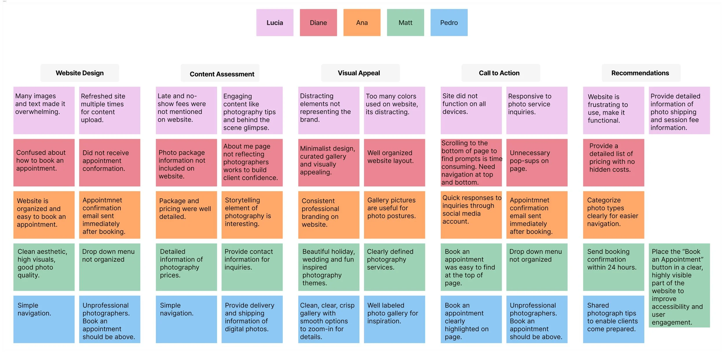 Conducted user interviews with 5 real photography clients to understand their needs, preferences, and behaviors when visiting a photography website.